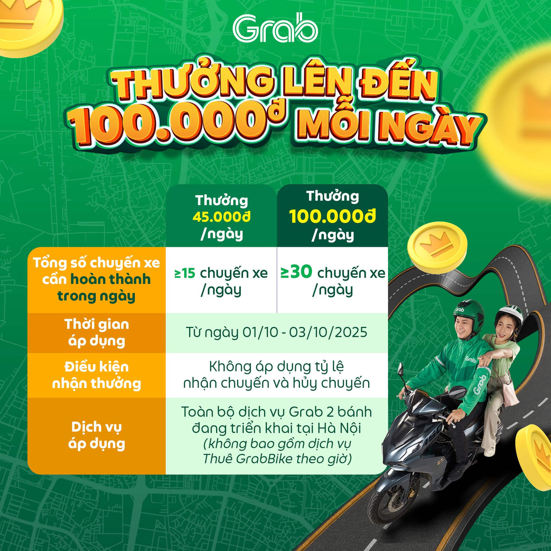 Grab thông báo triển khai chương trình thưởng dành cho Đối tác Grab 2 bánh tại Hà Nội, chi tiết như sau: