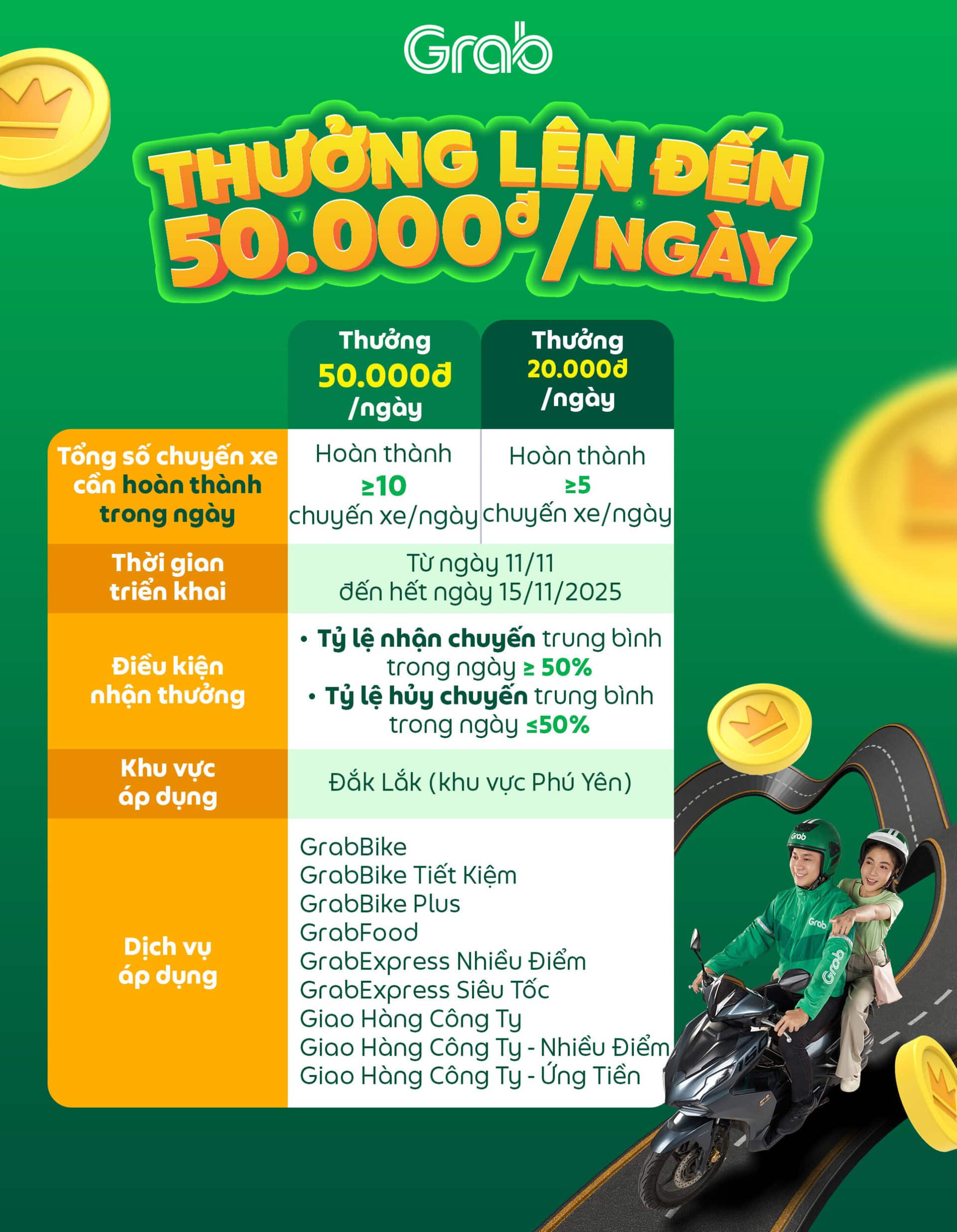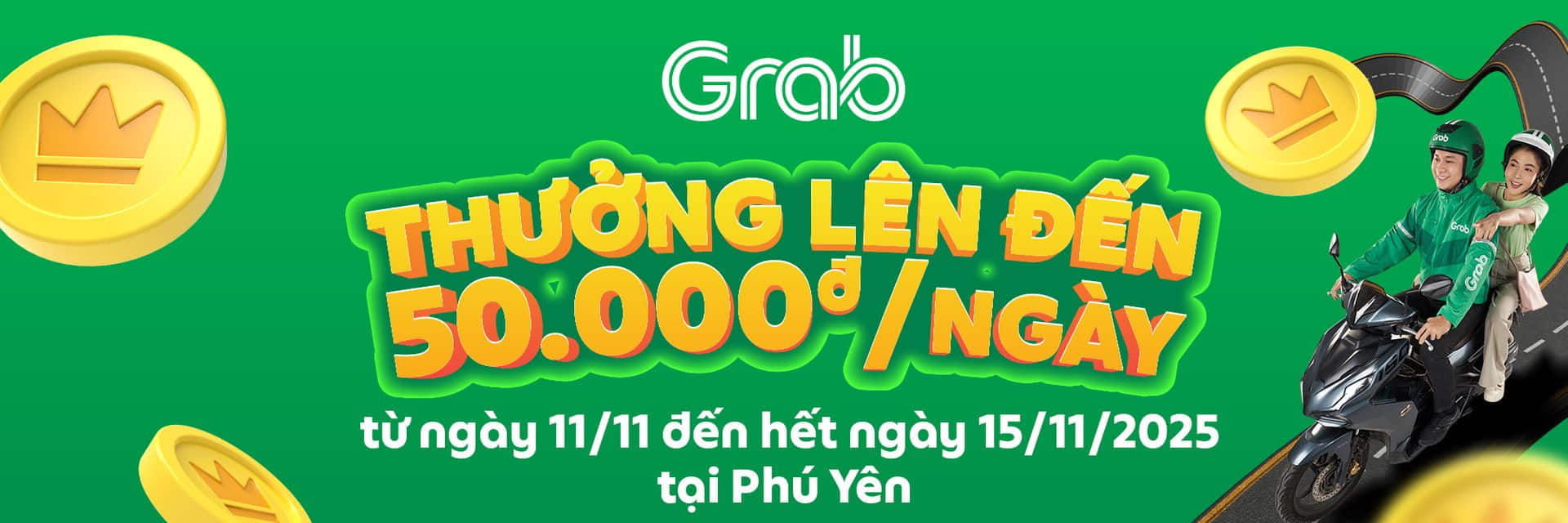 Grab xin gửi đến Quý Đối tác tại Phú Yên chương trình thưởng lên đến 50.000đ mỗi ngày, nhằm tiếp thêm động lực cho Đối tác trở lại hoạt động đầy năng suất. Thông tin như sau: