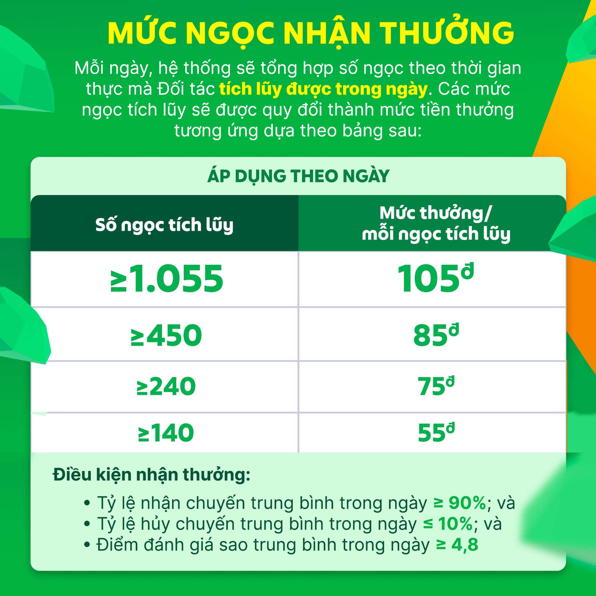 Điều kiện nhận thưởng của chương trình có thể thay đổi tùy theo quyết định của Grab vào từng thời điểm cụ thể và sẽ được thông báo đến Đối tác trước khi áp dụng.