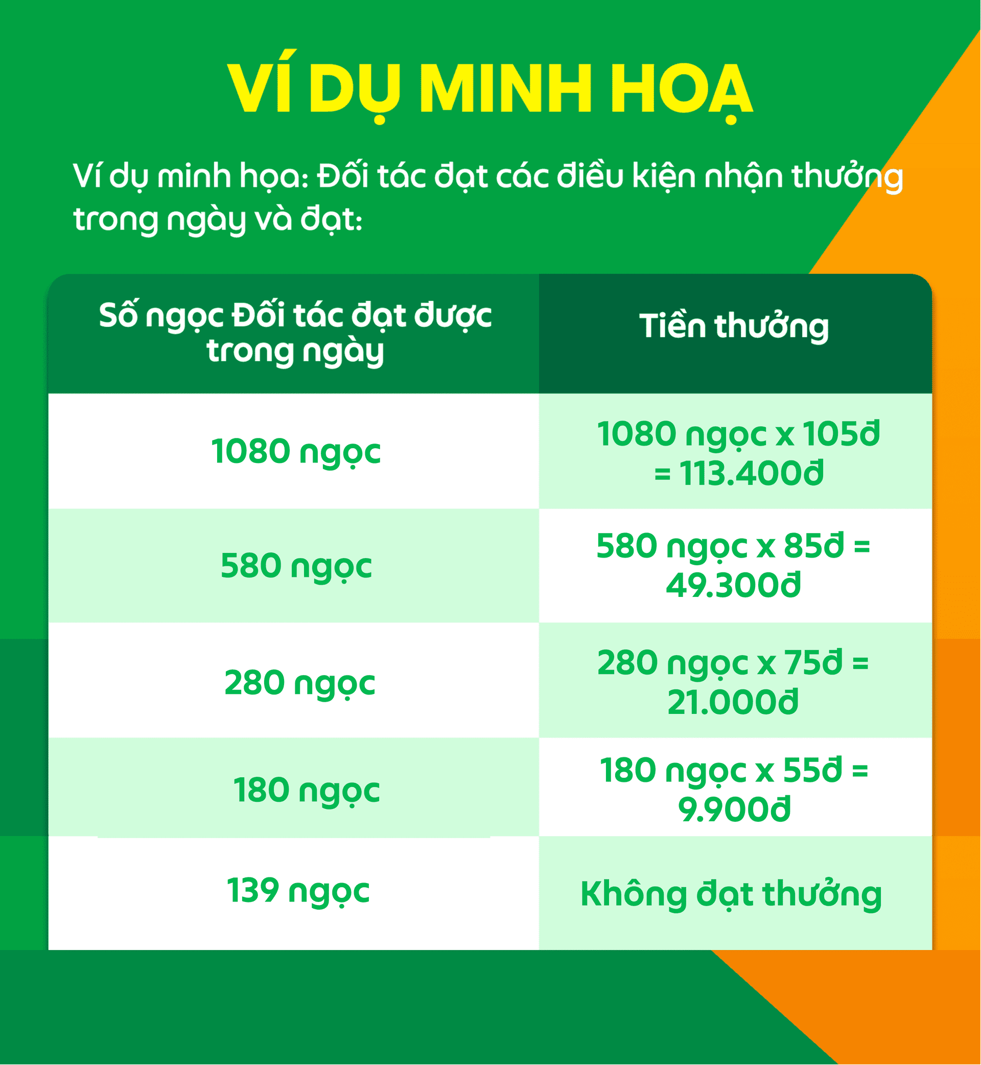 Tiền thưởng sẽ được tự động thanh toán vào Ví Tiền mặt của Đối tác vào ngày hôm sau khi đạt điều kiện nhận thưởng.