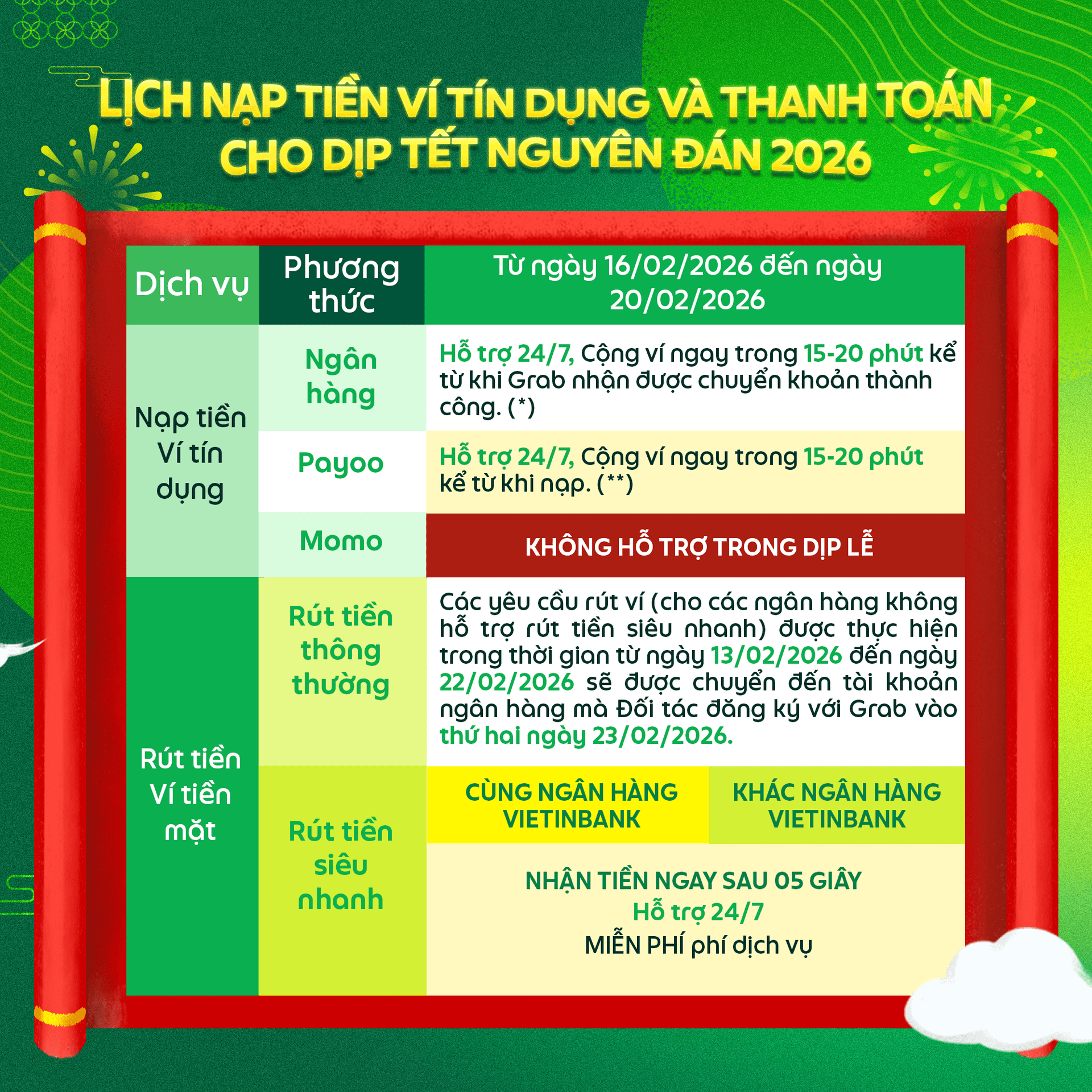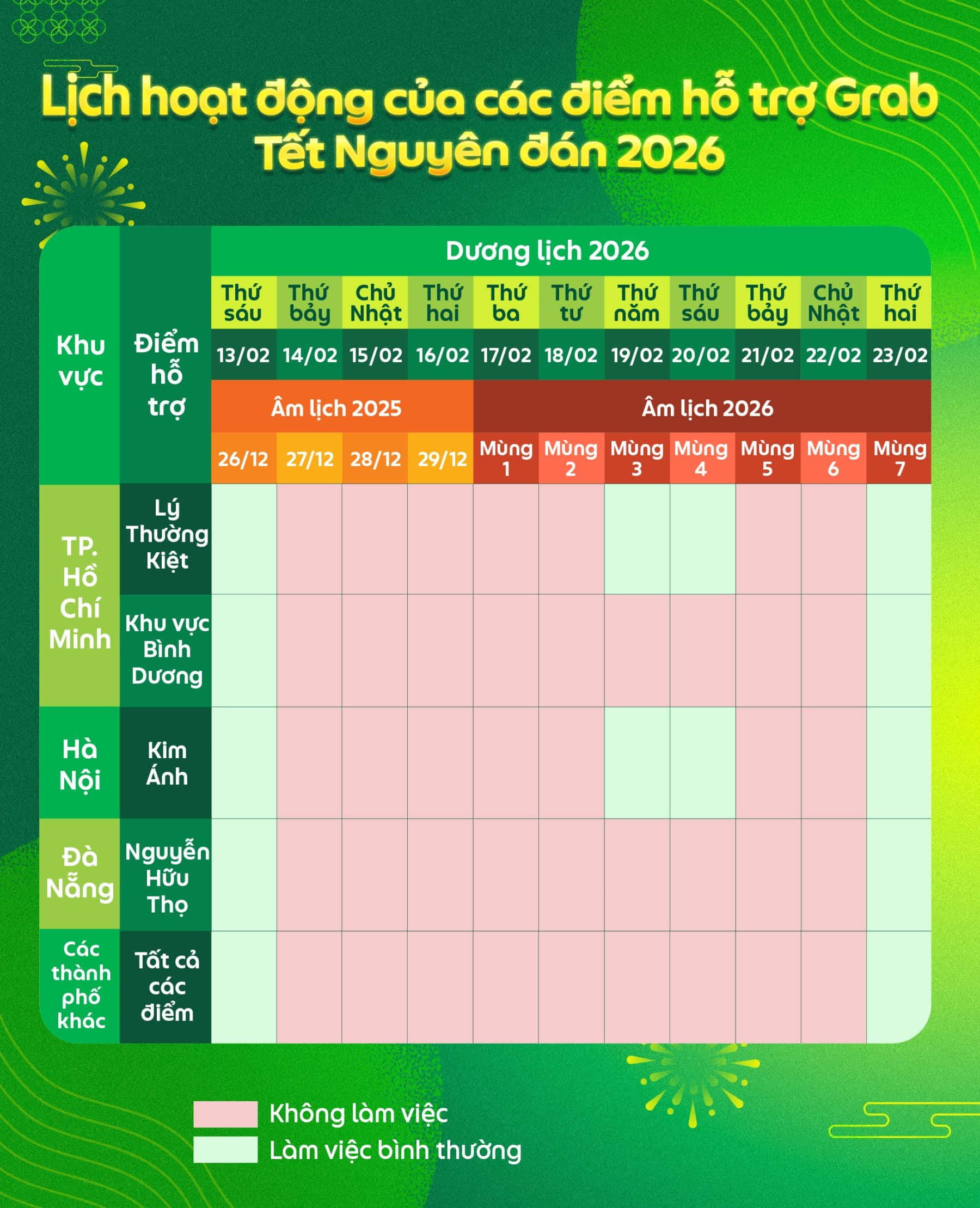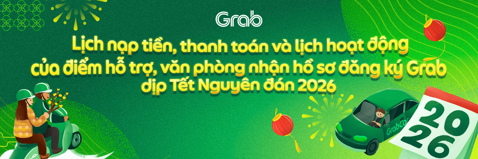 Để thuận tiện cho việc hoạt động trong dịp Tết Nguyên đán 2026 sắp tới, Đối tác vui lòng lưu ý về lịch làm việc/hỗ trợ của Grab, lịch nạp tiền ví tín dụng & thanh toán, cũng như các dịch vụ tạm ngưng hoạt động trong dịp Tết Nguyên đán. Chi tiết như sau: