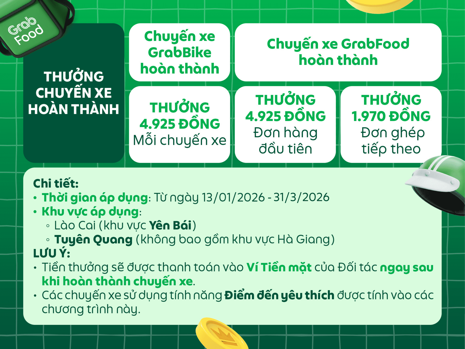 Grab mang đến cơ hội thưởng hấp dẫn cho Đối tác khi hoàn thành chuyến xe Grab 2 bánh với chi tiết như sau: