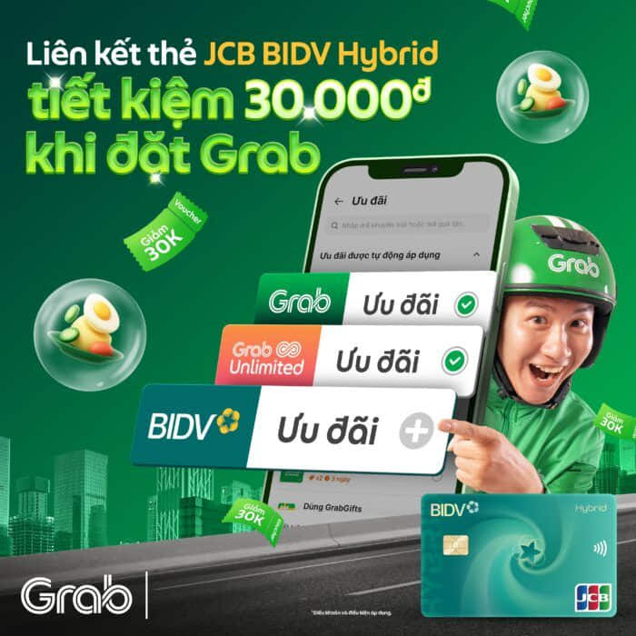Từ ngày 25/01/2025 đến hết ngày 31/12/2025, khi thanh toán dịch vụ GrabFood bằng thẻ tín dụng BIDV JCB Hybrid, bạn sẽ nhận được ưu đãi giảm đến 30.000đ mỗi ngày.
