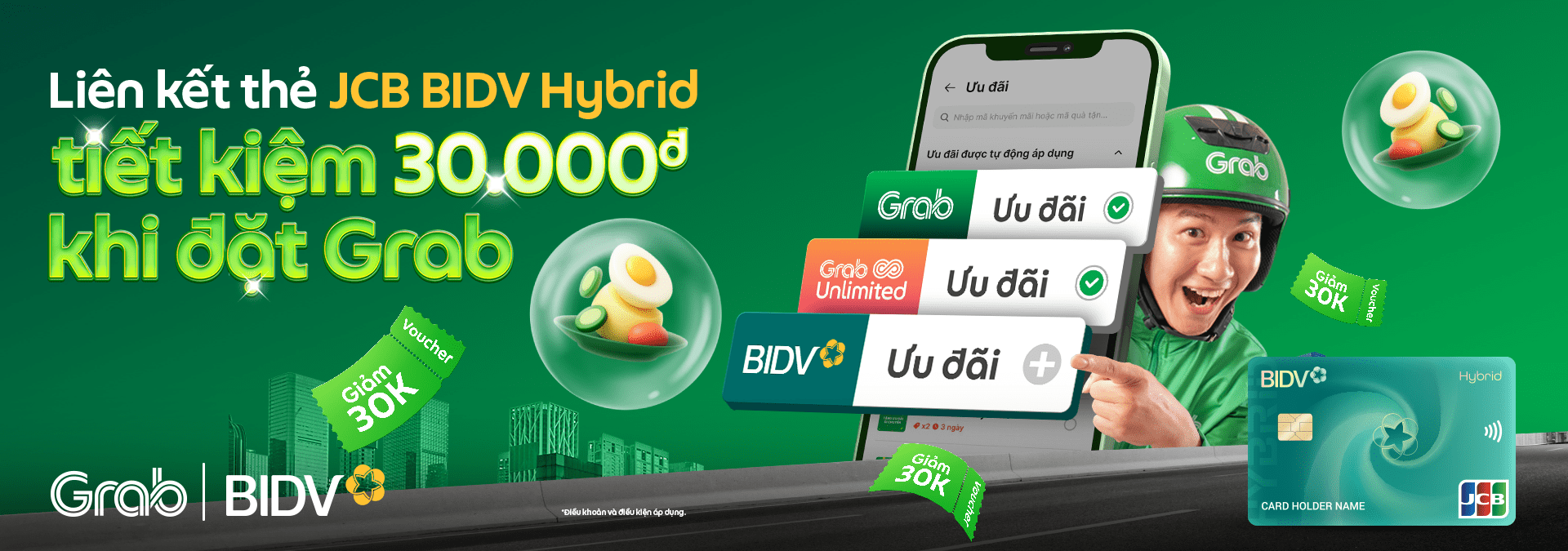 Từ ngày 25/01/2025 đến hết ngày 31/12/2025, khi thanh toán dịch vụ GrabFood bằng thẻ tín dụng BIDV JCB Hybrid, bạn sẽ nhận được ưu đãi giảm đến 30.000đ mỗi ngày.