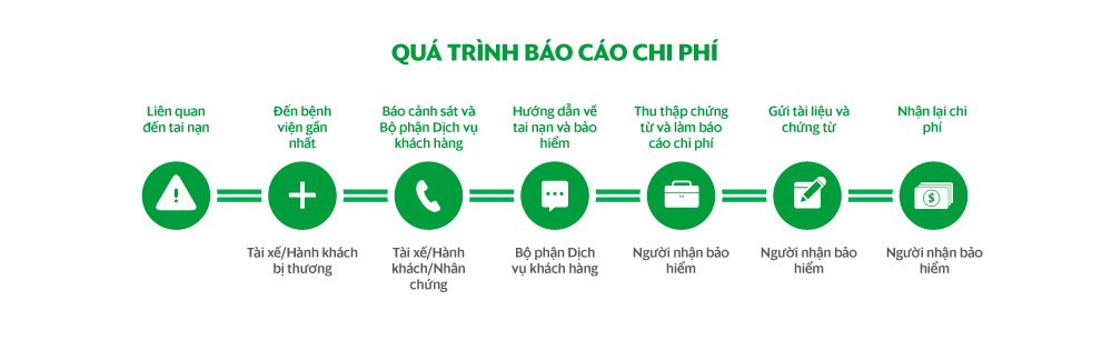 Khi người nhận bảo hiểm bị thương trong chuyến đi và dẫn đến nằm bệnh viện để điều trị, sau khi tiếp nhận đầy đủ hồ sơ bồi thường từ khách hàng (tài xế/hành khách), bảo hiểm sẽ giải quyết và thông báo kết quả trong vòng 20 ngày làm việc kể từ lúc nhận đầy đủ các chứng từ hợp lệ. Các trường hợp loại trừ khỏi bảo hiểm như: thương tật do chiến tranh, quân sự hoặc giải phẫu, bất kì hành động trái luật hoặc cố tình tự gây thương tích, tất cả biến chứng phát sinh từ thai kỳ hoặc các tình trạng bệnh lý có trước tai nạn, tác động của chất kích thích hoặc chất cồn, tham gia đua xe, các vấn đề về phẫu thuật thẩm mĩ và điều trị nha khoa.