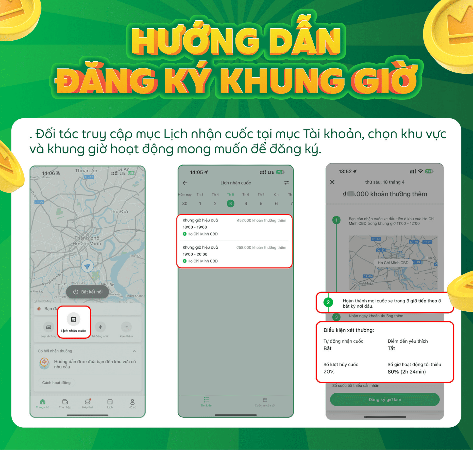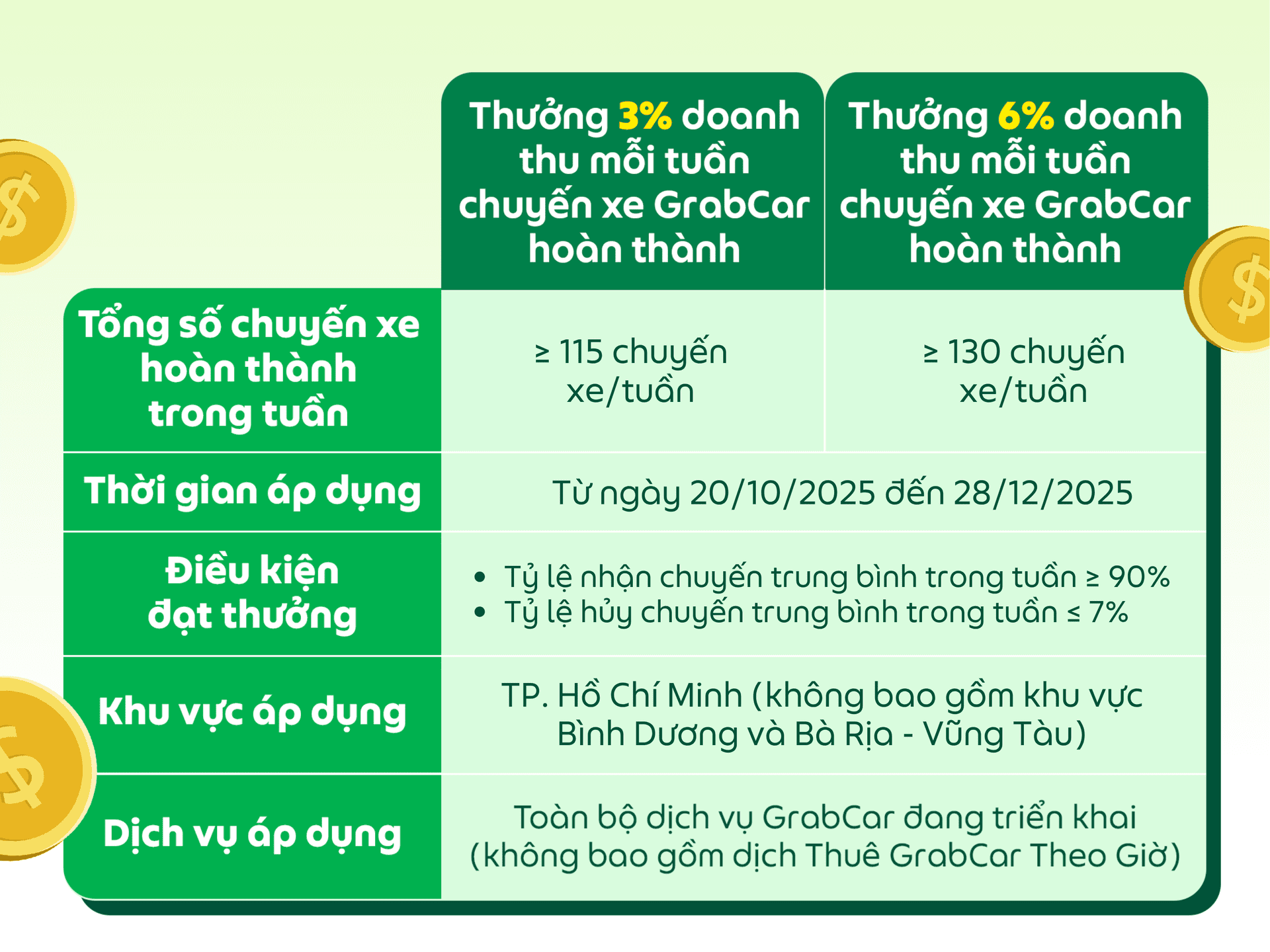 Các điều kiện của chương trình có thể thay đổi và sẽ được thông báo đến Đối tác, Grab có toàn quyền quyết định điều kiện và mức thưởng cuối cùng.