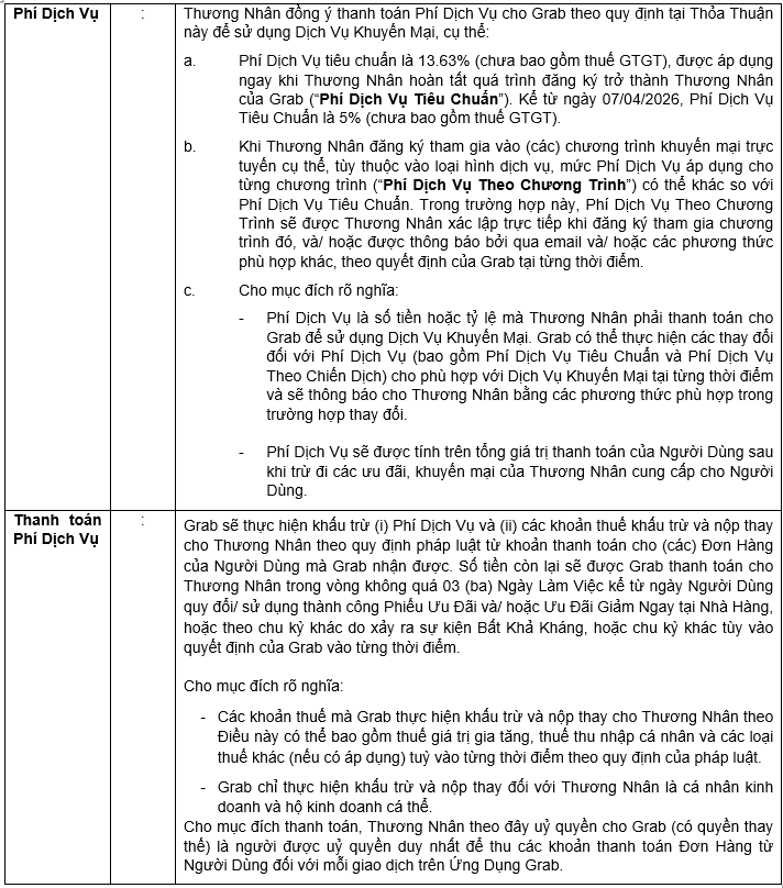 6.13. Thương Nhân ủy quyền cho Grab nhận các khoản thanh toán Đơn Hàng của Người Dùng.