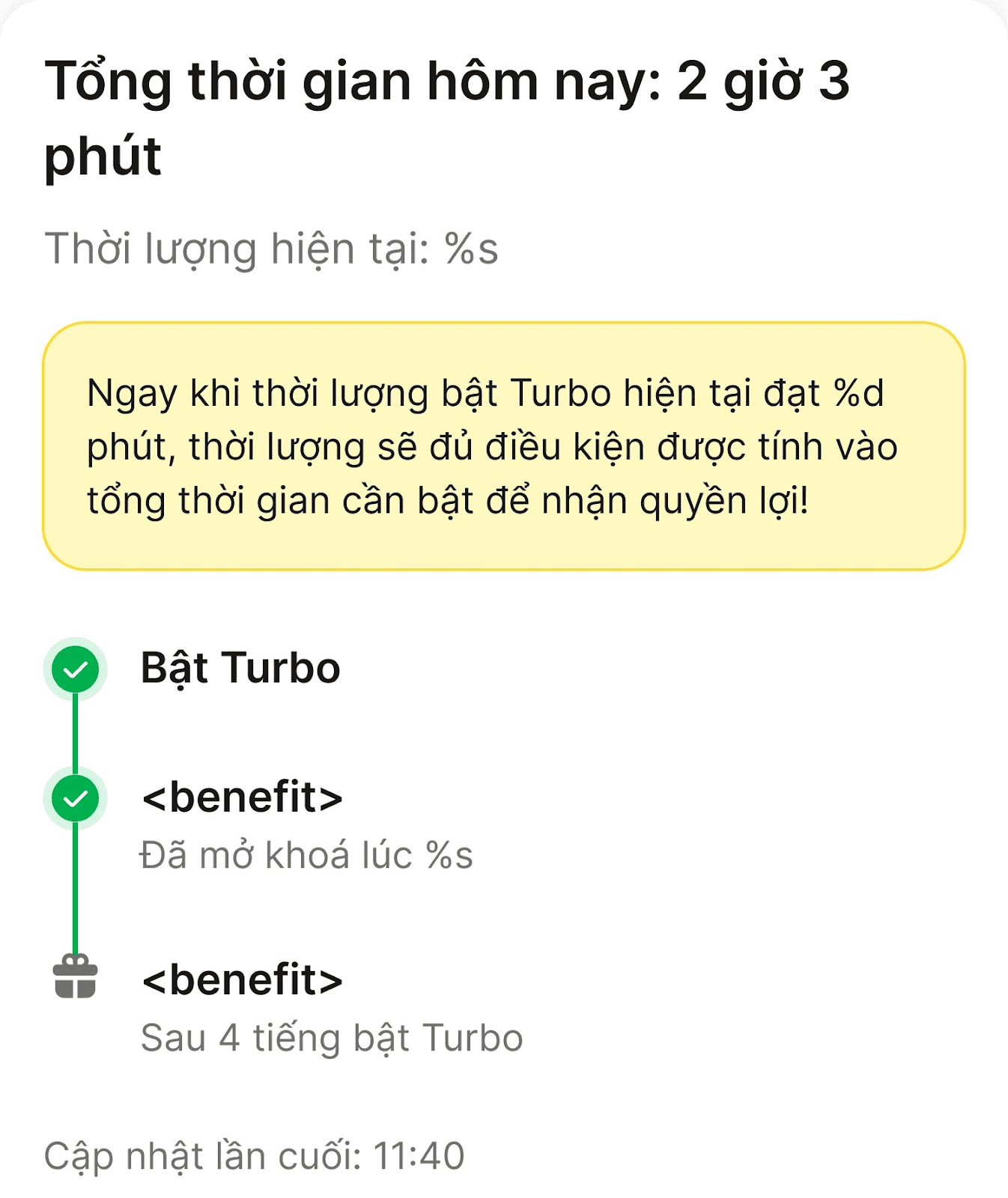 Hệ thống yêu cầu thời gian trực tuyến để Đối tác mở khóa các quyền lợi như: chọn nhiều Khu vực yêu thích để tăng cơ hội nhận chuyến xe, truy cập sớm vào chương trình Khung giờ hiệu quả…v.v. Đối tác có thể kiểm tra mục Turbo trên ứng dụng để biết số giờ trực tuyến cần thiết để mở khóa từng quyền lợi. Đối tác có thể theo dõi tổng thời gian bật Turbo trong ngày khi nhấn vào biểu tượng