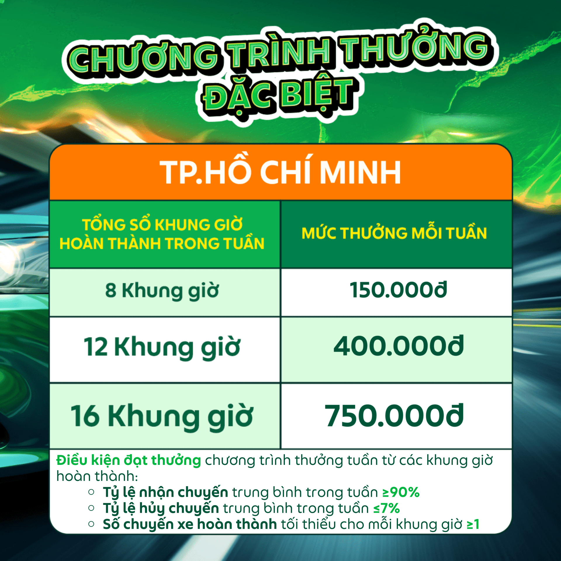 Tiền thưởng sẽ được hiển thị ngay trên màn hình cuốc xe và thanh toán vào Ví Tiền mặt của Đối tác ngay sau khi hoàn tất cuốc xe.